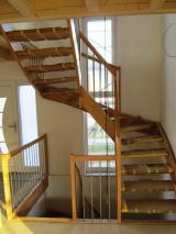 Ihr HOLZVERBUNDHAUS wird mit einer formschönen Innentreppenanlage vom Erdgeschoss ins Obergeschoss ausgestattet. Die Geschosstreppe wird als offene, versiegelte Massivholztreppe in Buche Natur stabverleimt ausgeführt. Die Treppe wird mit ca. 40 mm starken massiven Seitenwangen und ca. 40 mm starken Trittstufen, sowie Brüstungsgeländer, Handlauf, Pfosten mit quadratischer Grundfläche und senkrechten runden Geländerstäben ebenfalls in Buche handwerklich hergestellt. Die Treppenaußenbreite beträgt ca. 950 mm, die Treppenform nach Angebotszeichnungen entweder einläufig, halb- oder viertelgewendelt. Bei Häusern mit Spitzboden oder ausbaufähigem Dachgeschoss wird eine wärmegedämmte Bodeneinschubtreppe eingebaut.